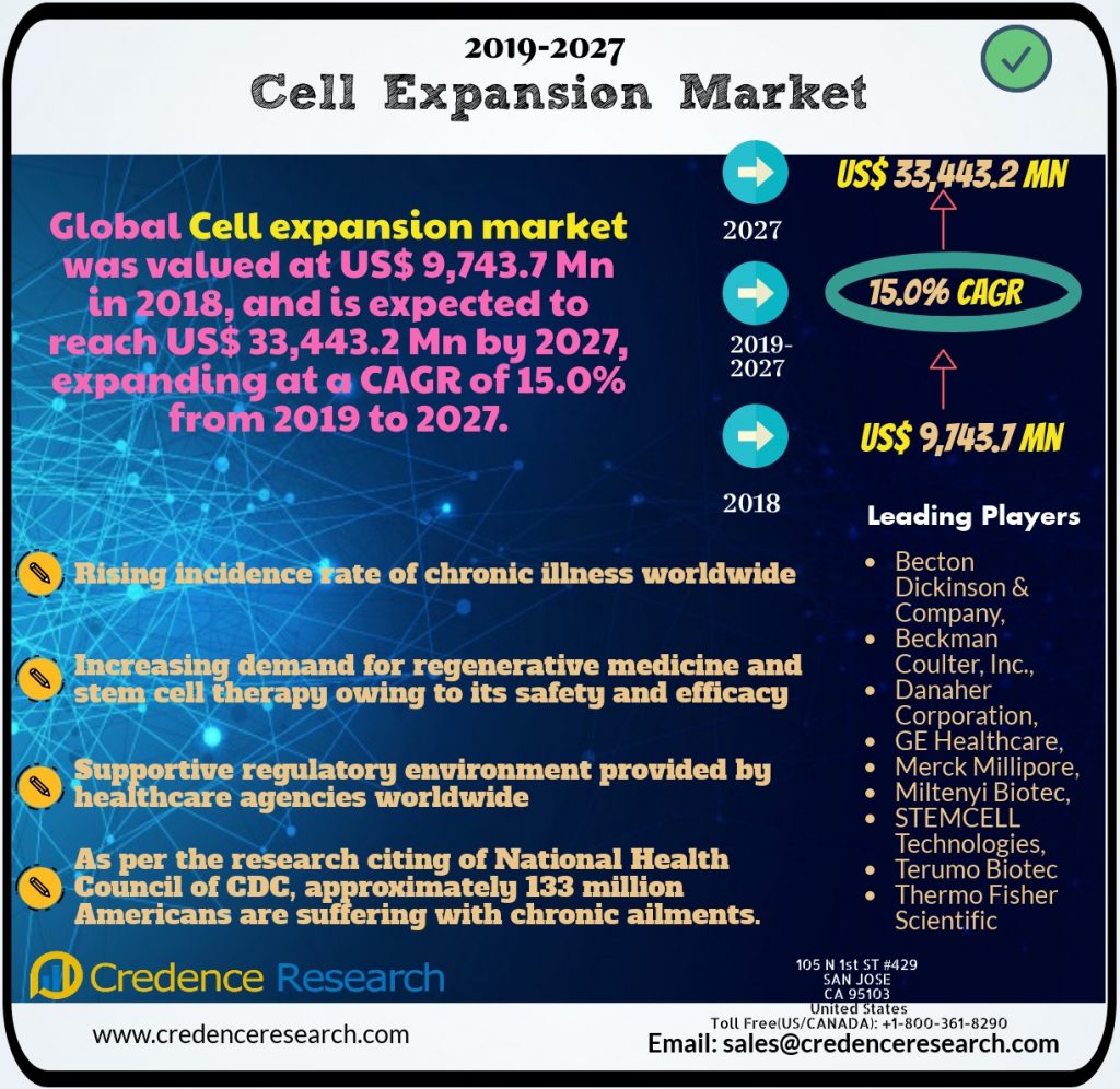 The latest market report published by Acute Market Reports, Inc. “Global Cell Expansion Market – Growth, Future Prospects, Competitive Analysis, 2019- 2027,” the global cell expansion market was valued at US$ 9,743.7 Mn in 2018, and is expected to reach US$ 33,443.2 Mn by 2027, expanding at a CAGR of 15.0% from 2019 to 2027.