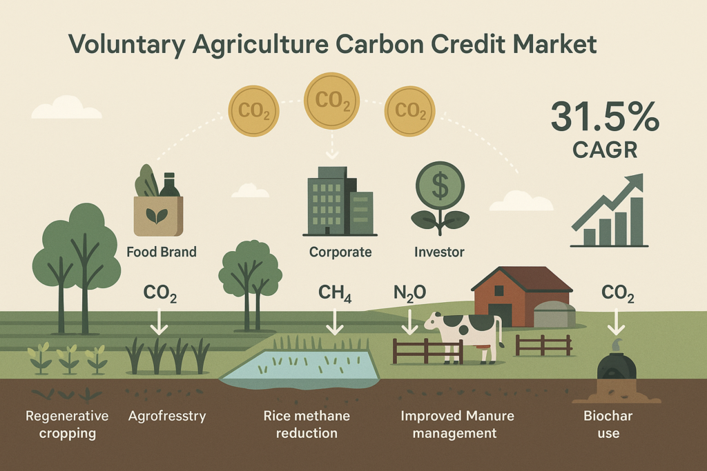 The voluntary agriculture carbon credit market is expanding at a strong 31.5% CAGR as food companies, corporates, and investors look to climate-smart farming as a practical source of verified carbon reductions and removals. Farms are no longer viewed only as production units; they are emerging as important climate tools. By changing how soils are managed, how water is used in rice fields, how livestock and manure are handled, and how residues are treated, agriculture can deliver large-scale, relatively low-cost mitigation while maintaining or even improving productivity.