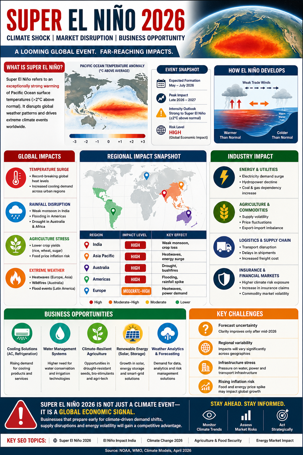 A “super” El Niño refers to extreme intensity (≥2°C above average), historically linked with major global disruptions such as the 1997–98 and 2015–16 events. Current climate models suggest that 2026 could experience similar or stronger intensity, making it a critical topic for businesses, policymakers, and investors.